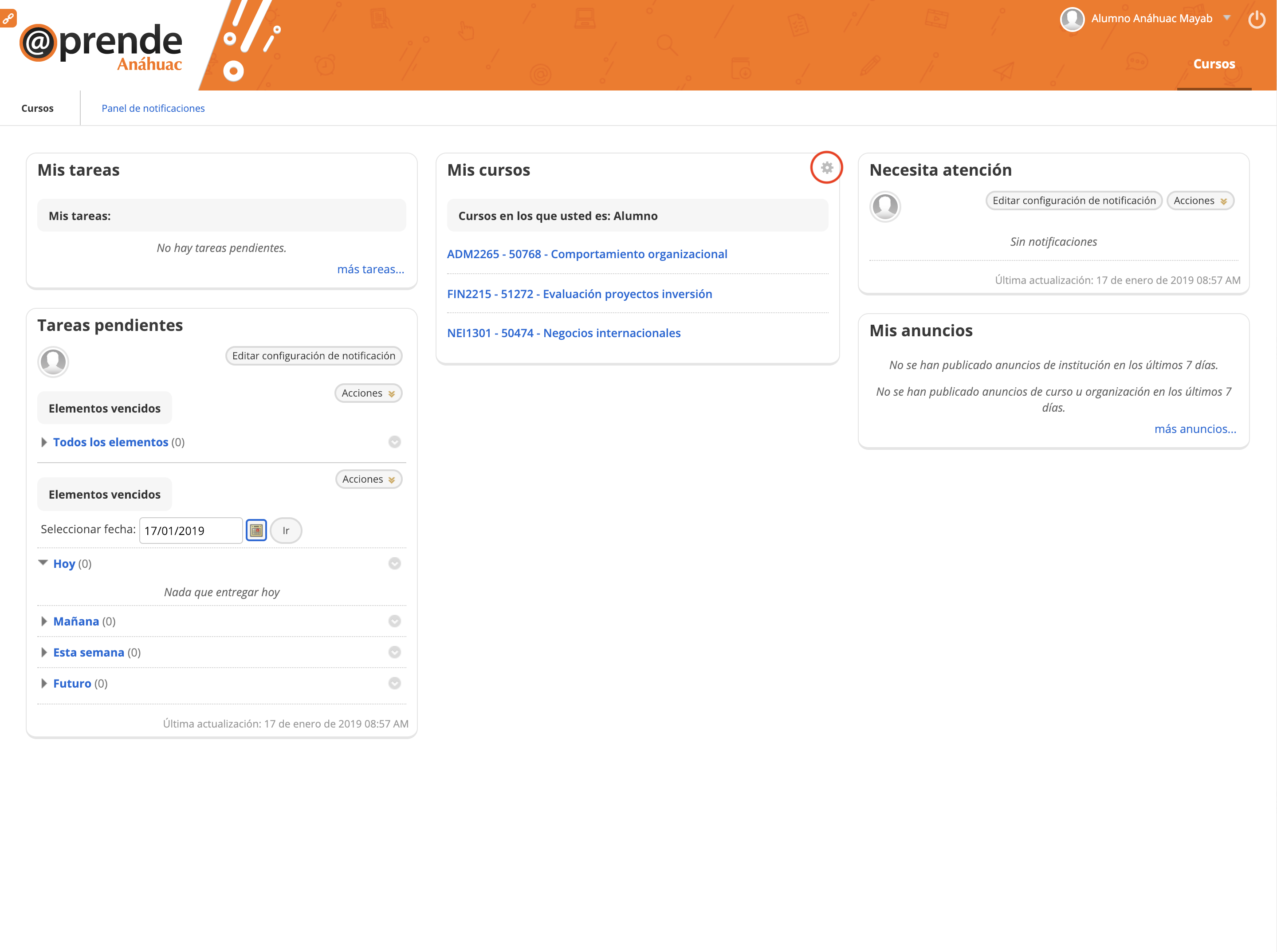 En la ventana principal iniciar sesión, pasa el mouse por el módulo Mis Cursos y haz click en el engranaje que aparece en la esquina superior derecha.