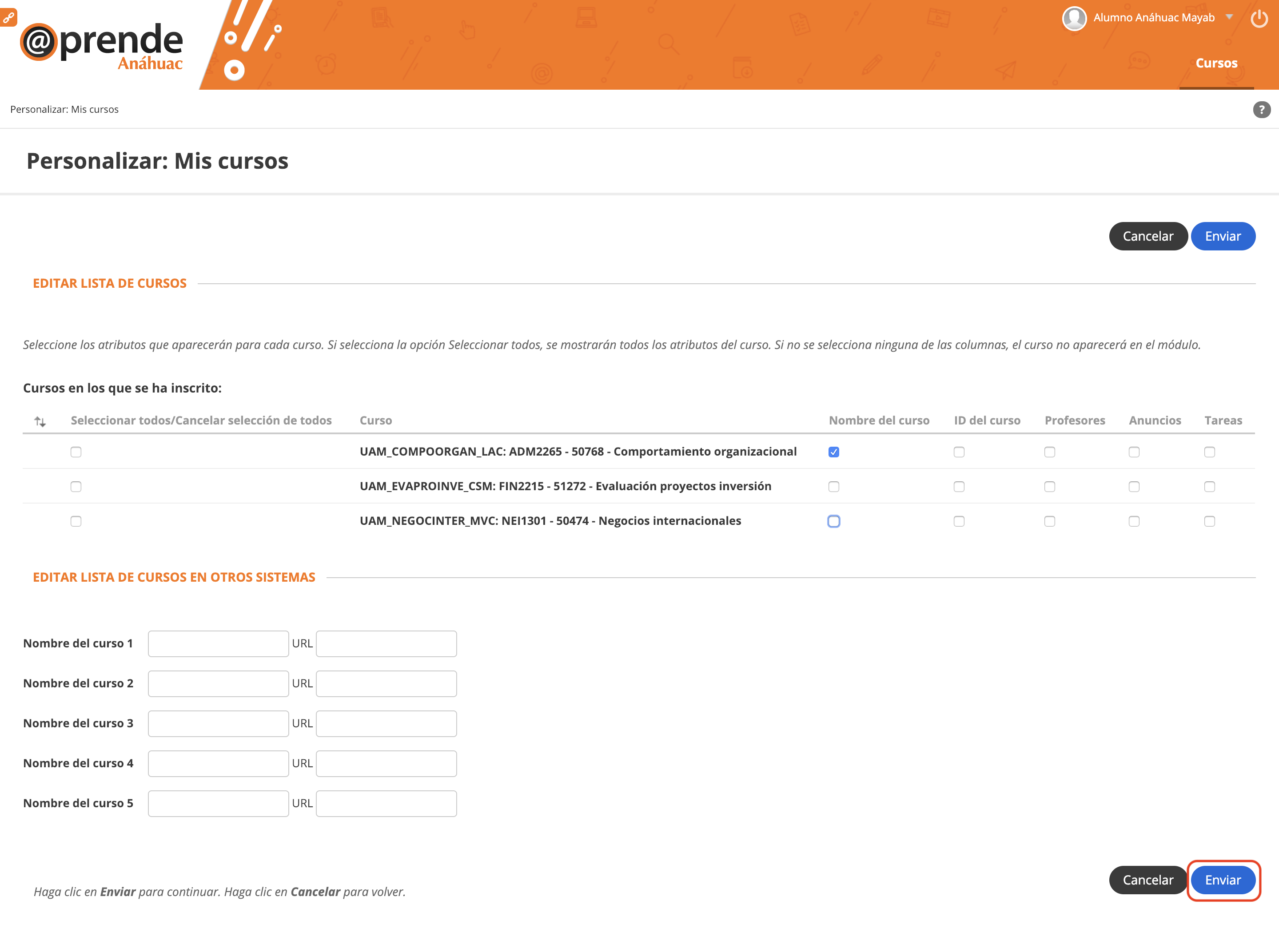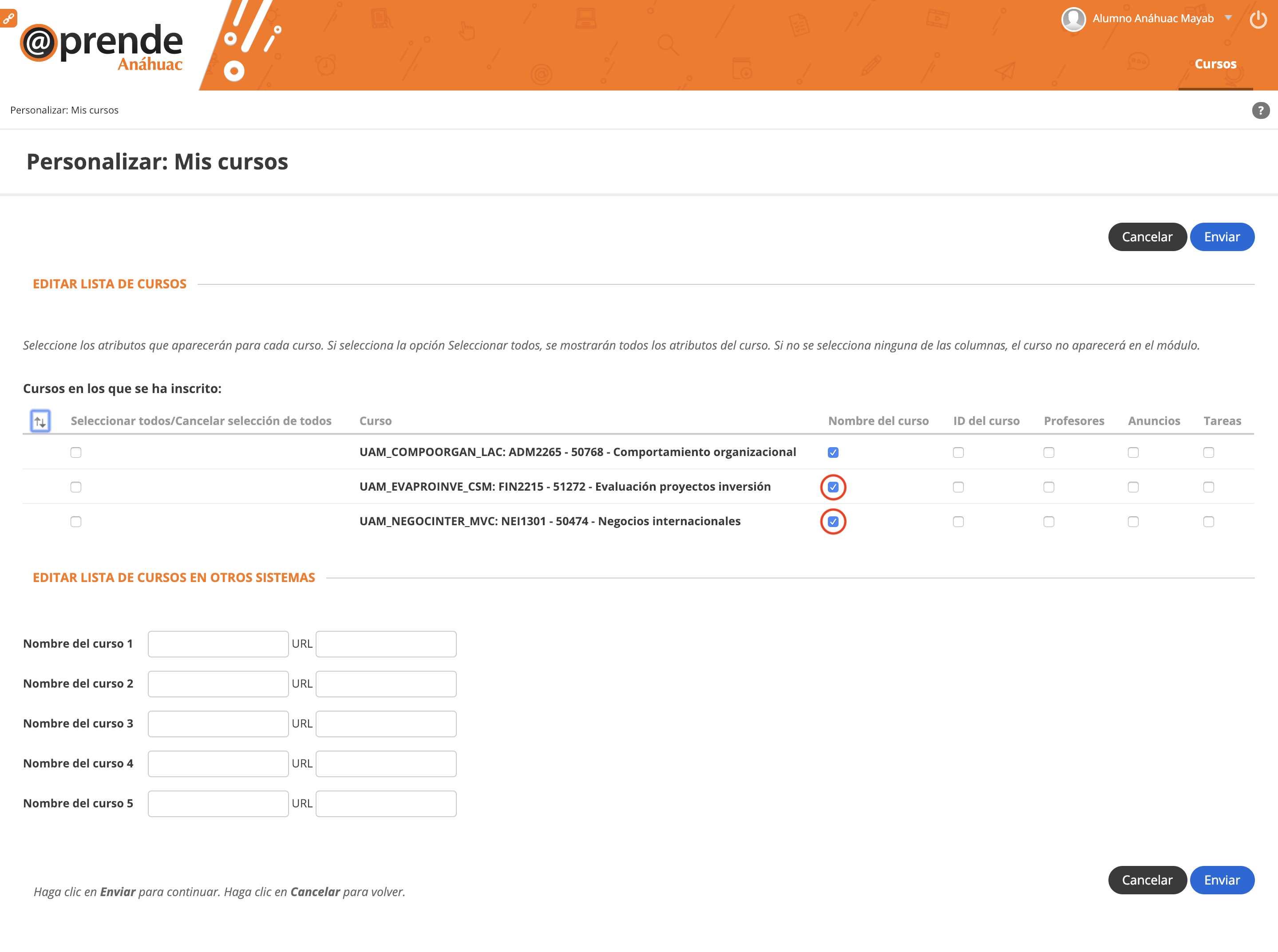 En la nueva ventana verás todos los cursos a los que estás inscritos. Para ocultarlos de la vista principal, solamente tienes que quitar la paloma de las casillas de verificación en el renglón de cada curso que no deseas ver más.