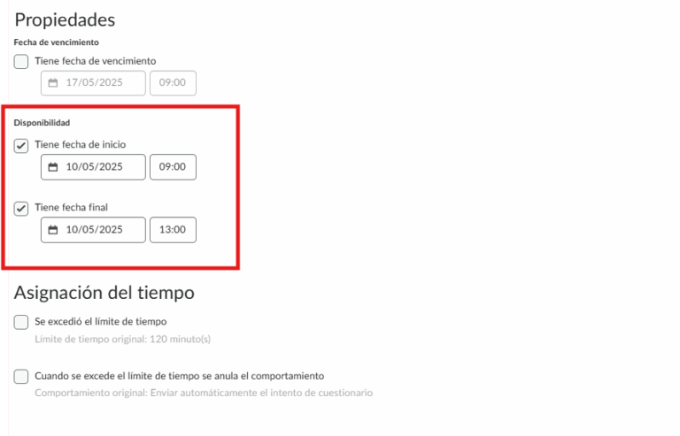 - Paso 5. En las “Propiedades”, realiza las modificaciones necesarias a criterio del profesor (fecha de inicio y final, límite de tiempo implementado, comportamiento al exceder el límite de tiempo, intentos, etc.).