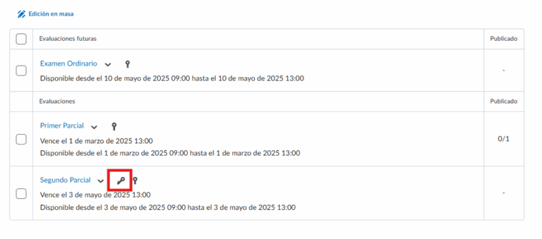 - Paso 7. Si la configuración ha sido correcta, la evaluación o actividad mostrará el ícono de llave, indicando que esa prueba tiene un acceso especial.