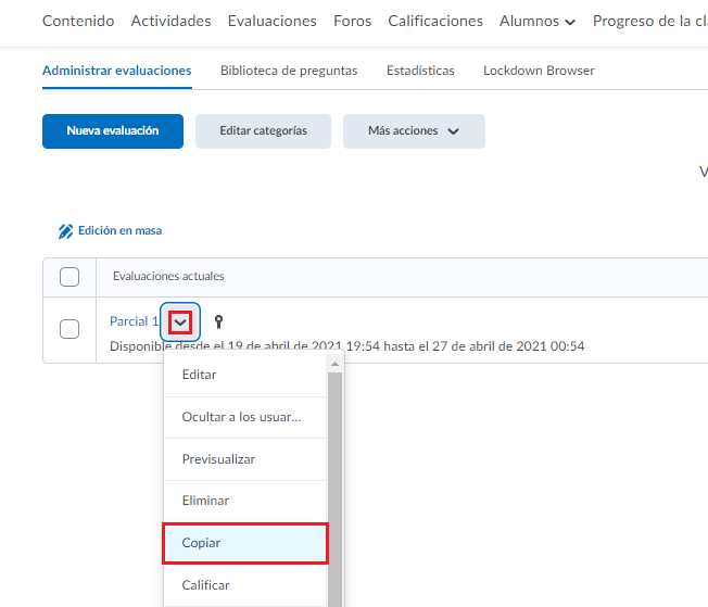 - Paso 2. Damos clic a la flecha que se encuentra a lado del nombre de la evaluación que queremos duplicar y elegimos la opción copiar.