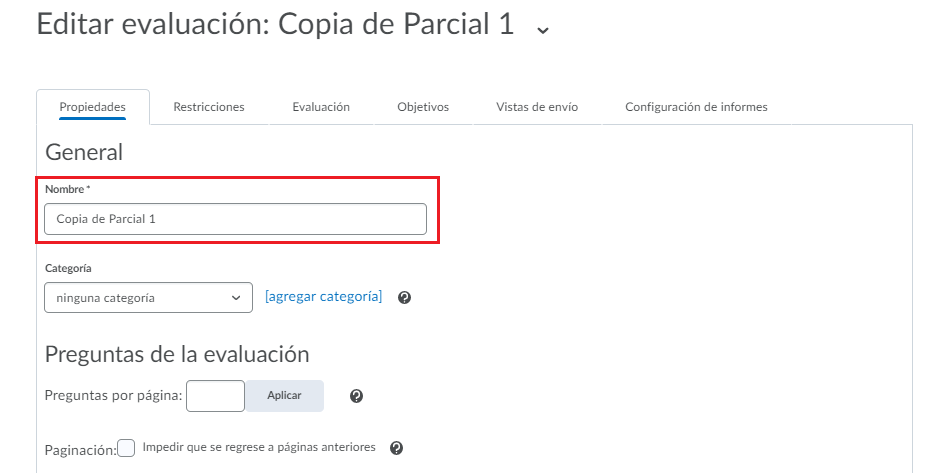 Entre las configuraciones de la evaluación que podemos modificar: