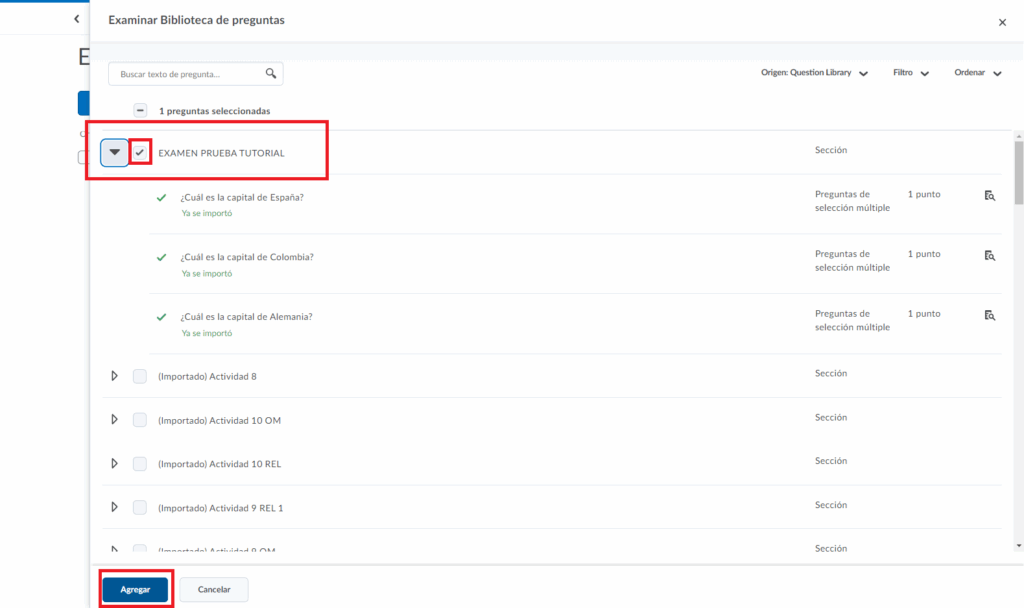 - Elegimos nuestra sección de preguntas o las preguntas específicas que queremos agregar a nuestra evaluación, y le damos clic al botón de agregar.