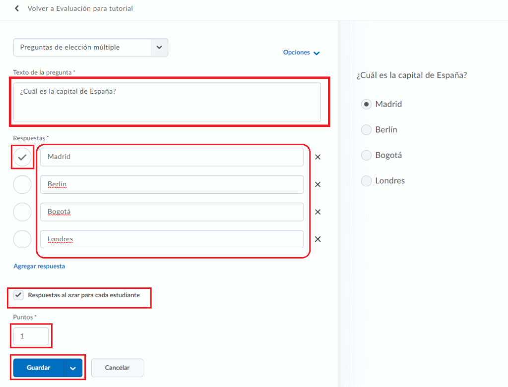 - Escribimos la pregunta, las posibles respuestas y marcamos cuál es la respuesta correcta. Activamos la casilla de respuestas al azar para cada estudiante, y justo abajo podemos configurar las puntuaciones de la pregunta actual. Al finalizar, le damos clic en guardar. Este procedimiento se repetirá por la cantidad de preguntas que queramos agregar.
