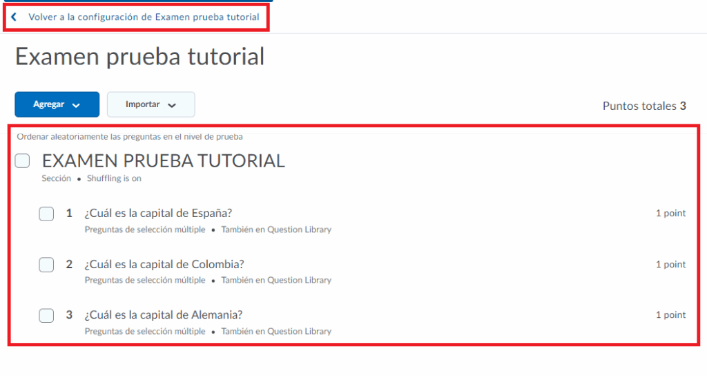 Nota: Si no tenemos preguntas creadas en la biblioteca de preguntas y queremos crearlas, favor de ver el tutorial de “Creación de banco de preguntas”.