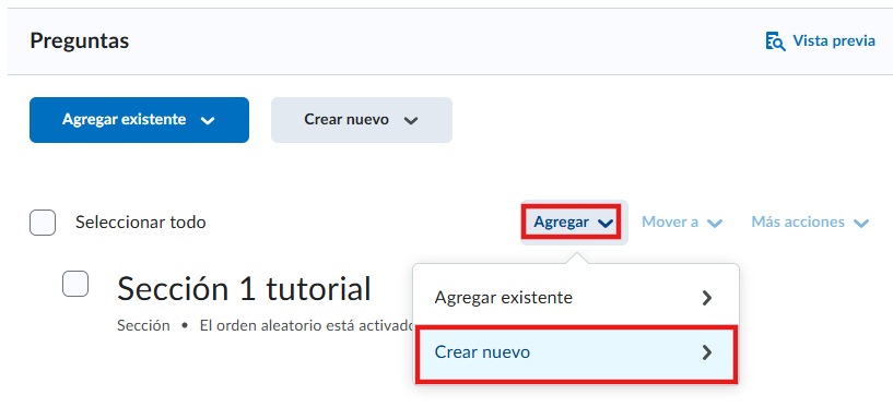 - Caso 1, en el caso de que queramos crear las preguntas directamente, le damos clic en crear nuevo. Y para tener una mayor organización, crearemos una sección.
