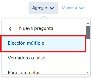 - Ahora sí, es momento de agregar nuestras preguntas. Le damos clic al botón de agregar, y elegimos la opción de crear nuevo, elegimos nueva pregunta, nos saldrán los diferentes tipos de preguntas que podemos crear, en este caso haremos preguntas de elección múltiple.