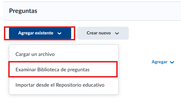 - Caso 2. Si tenemos preguntas ya creadas en la biblioteca de preguntas, le damos clic al botón de agregar existente , y elegimos la opción de examinar biblioteca de preguntas.
