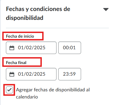 - En este espacio asignamos las fechas de inicio y final del examen. Es importante que activen la casilla de agregar al calendario, para que los alumnos puedan ver la fecha con mayor facilidad.