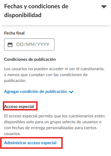 - En caso de que sea necesario que la evaluación esté disponible únicamente para ciertos alumnos, esta configuración puede realizarse en la sección de Acceso especial. Para más detalles, consulte el tutorial “¿Cómo brindar acceso especial a evaluaciones?”.
