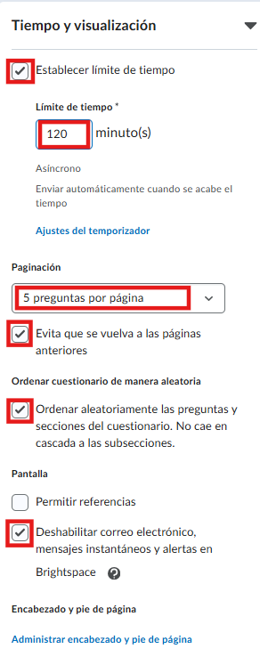 - Configure un límite de tiempo adecuado para la evaluación, considerando la cantidad y complejidad de las preguntas creadas.