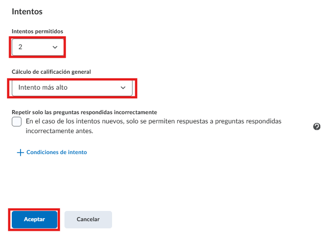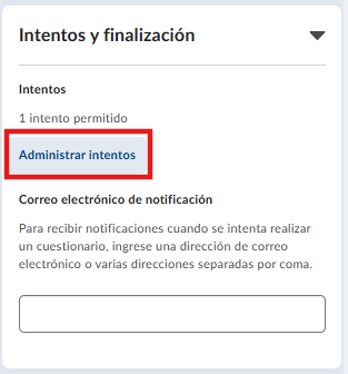 - En la sección Intentos, configure la cantidad de oportunidades que los alumnos tendrán para realizar la evaluación. Si permite más de un intento, acceda a Administrar intentos para establecer el número deseado. En el apartado Cálculo de la calificación general, seleccione la opción Intento más alto como criterio de evaluación.