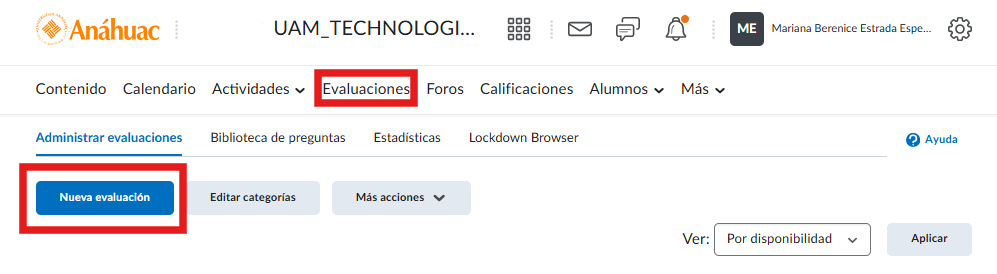 Nos vamos a la pestaña de evaluaciones , en la vista de administrar evaluaciones se encuentra un botón para la creación de una nueva evaluación. Le damos clic.