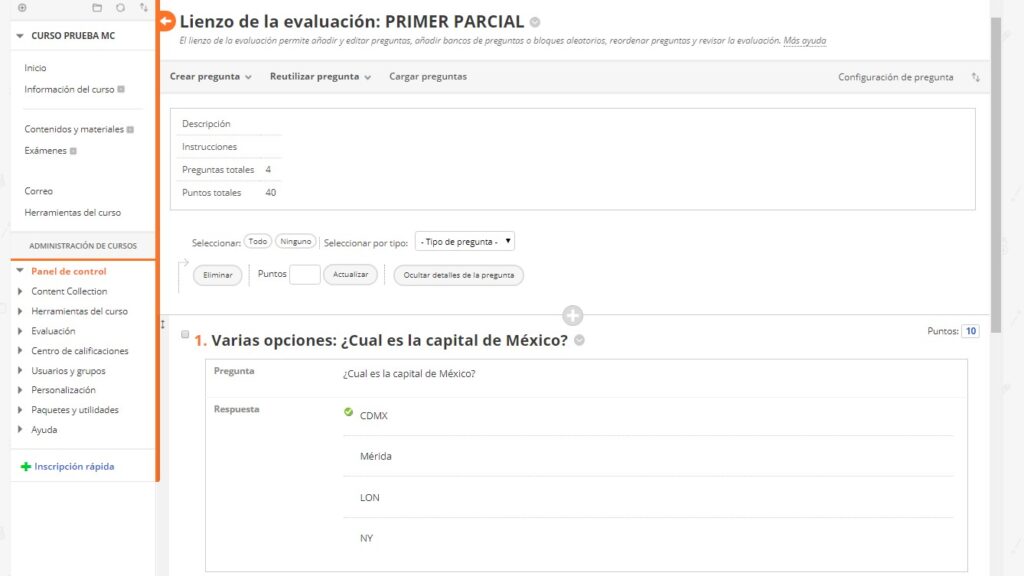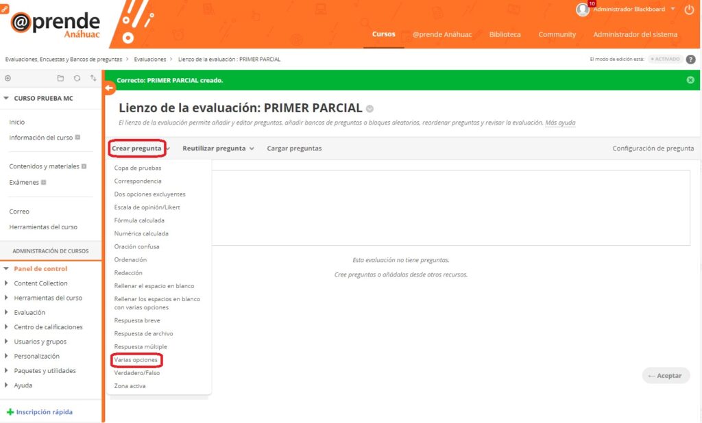 Esto nos desplegará la pantalla para crear preguntas de opción múltiple.