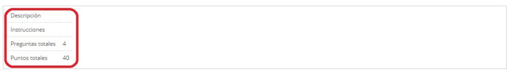 En el primer cuadro, encontraremos la descripción si pusimos una, las instrucciones si pusimos una, el número de preguntas totales y el total del puntaje de la autoevaluación.