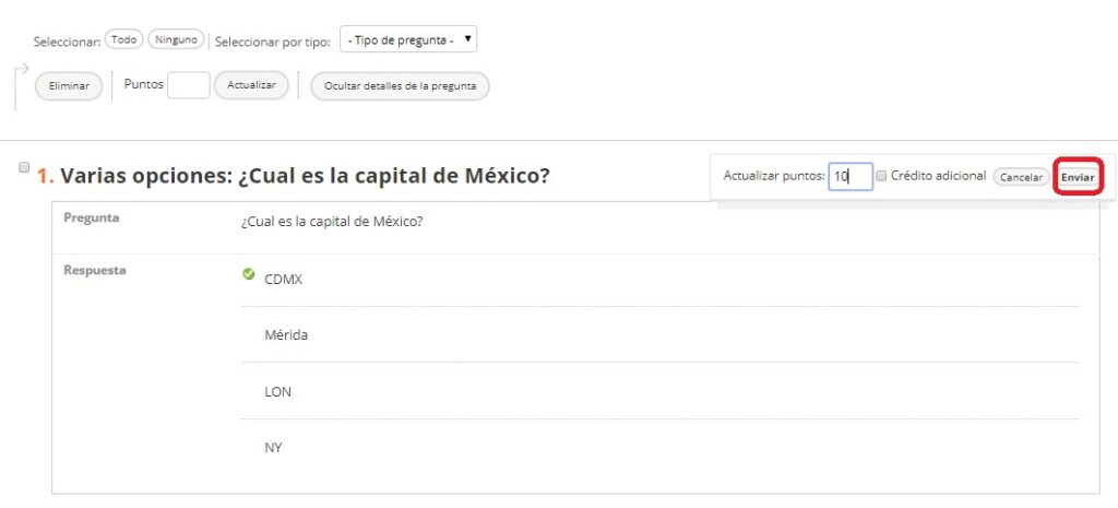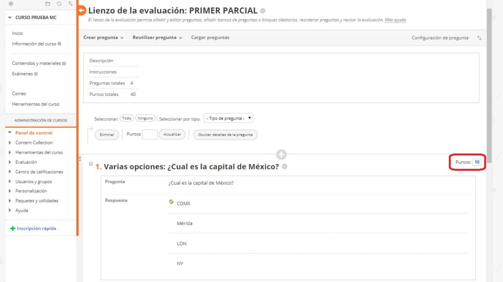 Paso 10. Para modificar el puntaje nos dirigimos a la casilla titulada como puntos y agregamos los puntos que consideremos que debe valer la pregunta.
