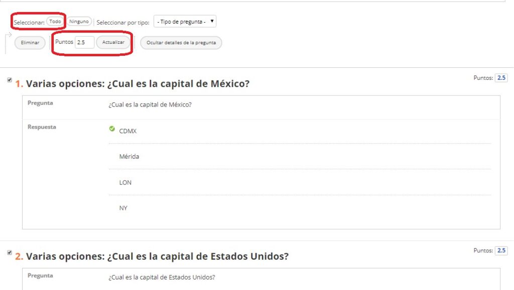 Al finalizar aparecerá una ventana con todas las preguntas que hemos construido, en la cual podemos modificar el puntaje y revisar que pregunta establecimos como la correcta.