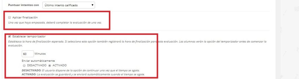 Recuerde, en caso de no querer más de un intento para realizar no seleccionamos la casilla.
