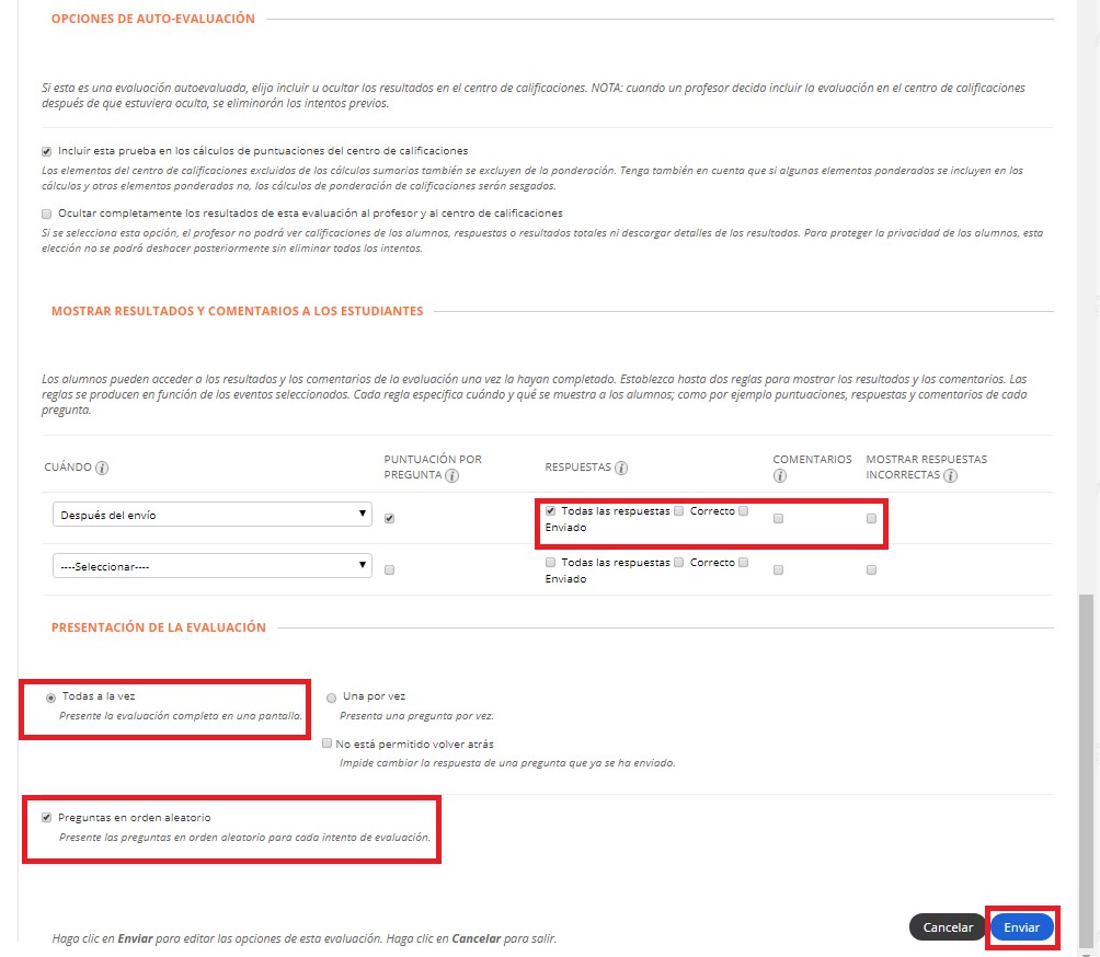 Paso 16. Después nos desplazamos a la parte final de las opciones omitiendo modificar opciones de autoevaluación. Y en mostrar resultados y comentarios a los estudiantes damos clic en la casilla todas las respuestas a los estudiantes. En presentación de la evaluación seleccionamos las opciones todas a la vez y preguntas en orden aleatorio.