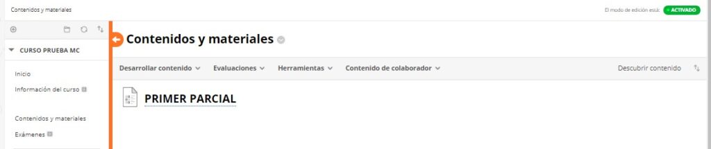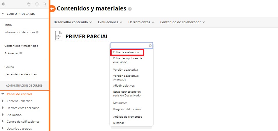 Si queremos editar alguna de las opciones antes vistas, nos posicionamos al lado del título de la autoevaluación creada y aparecerá una flecha gris, damos clic y se nos desplegarán las opciones para modificar la prueba. Si damos clic en editar la evaluación, nos parecerá la pantalla lienzo de la prueba donde podremos o agregar más preguntas o cambiar el puntaje.