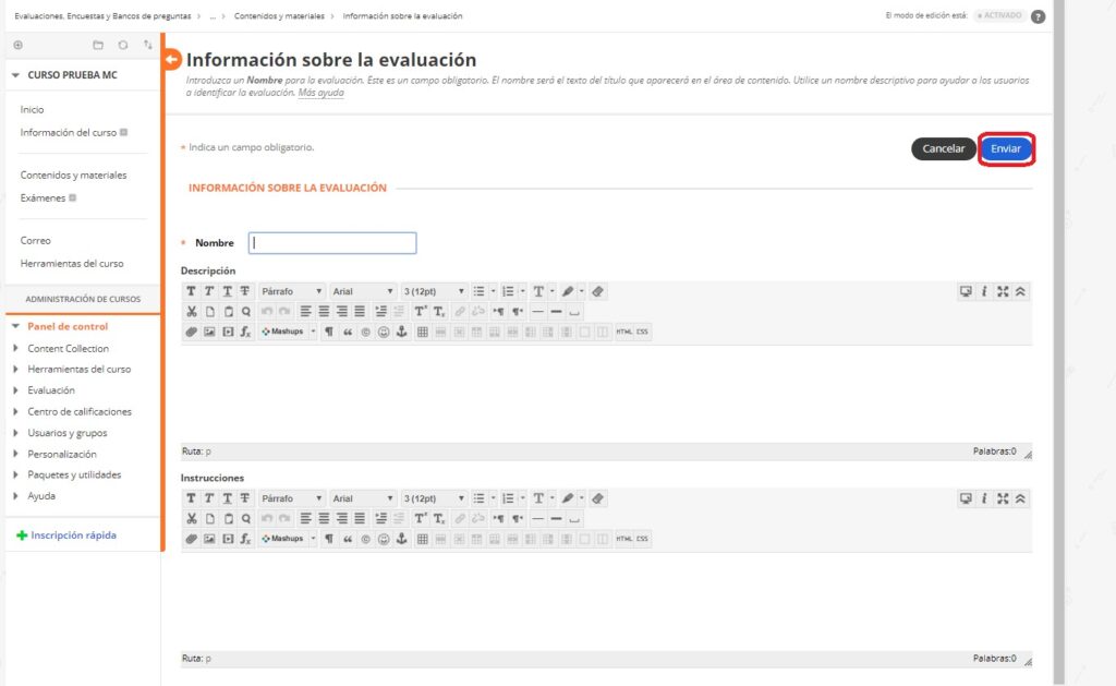 Paso 4. Ahora aparecerá la pantalla información sobre la evaluación en donde podremos titular nuestra prueba. Te recomendamos titularla con un nombre fácilmente identificable, por ejemplo: Parcial 1, Parcial 2 Ordinario, Actividad autocalificable 1, actividad autocalificable 2, etc.