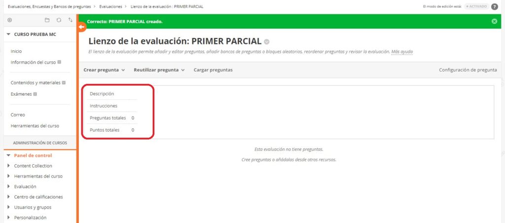 Paso 5. Esto nos desplegará la pantalla del lienzo de la evaluación en donde podremos comenzar a crear las preguntas de nuestro autocalificable. En ella también encontraremos un recuadro donde se nos presenta la información referente a nuestra autocalificable la cual agregamos con anterioridad: descripción e instrucciones, así como el total de preguntas y de puntos totales.