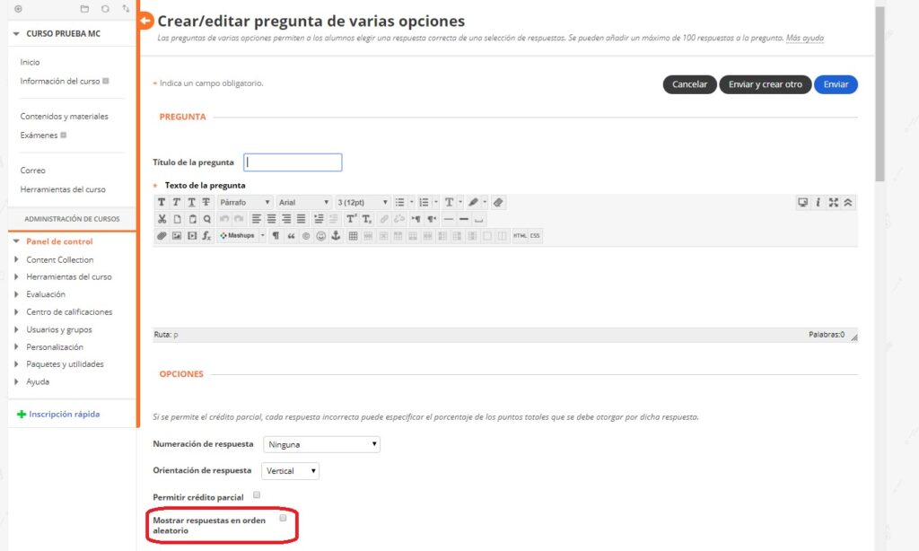 Paso 7. En título de pregunta no colocamos nada. En texto de pregunta colocamos la pregunta que deseamos que el alumno responda. En el apartado de opciones damos clic en mostrar respuesta en orden aleatorio.