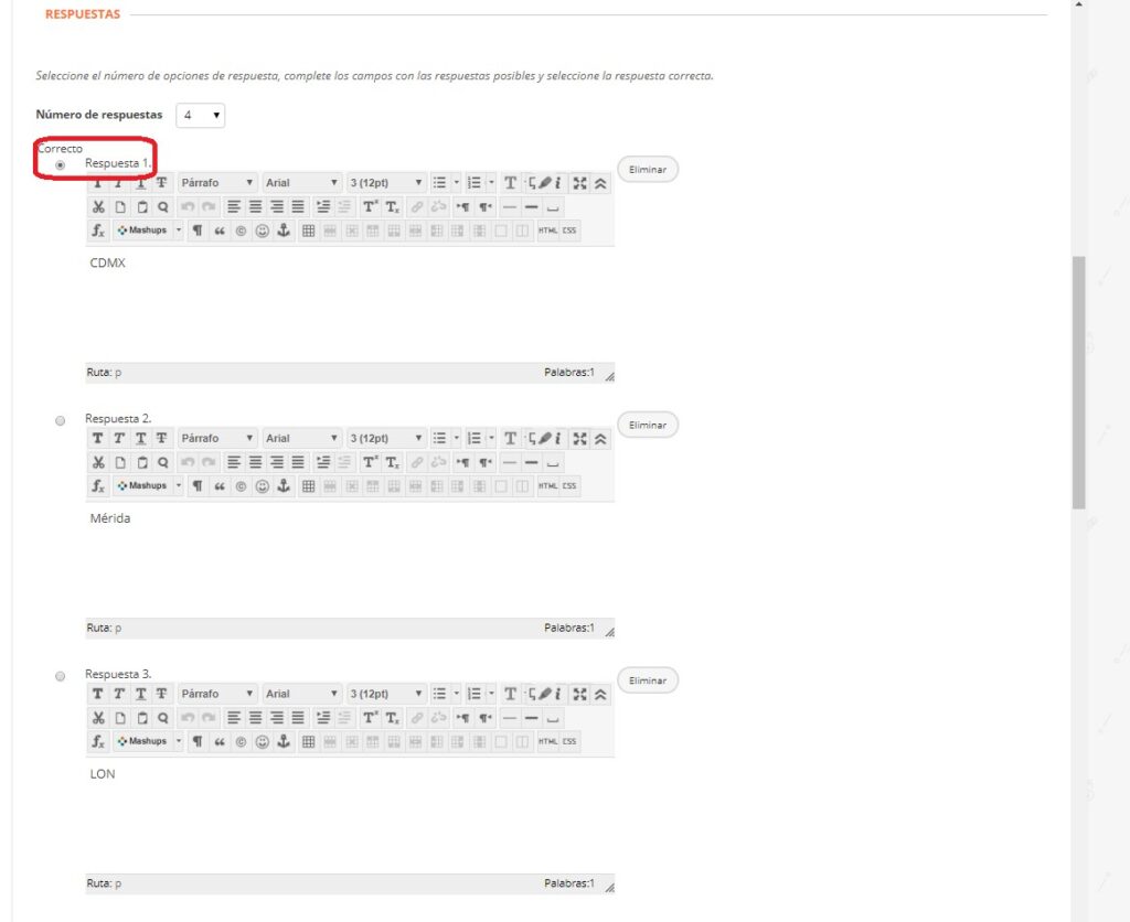 Paso 8. Ahora navegamos a la parte de debajo de la pantalla y en la parte de respuestas, escribimos en cada casilla las opciones de respuesta que podrá seleccionar el alumno, colocando siempre la respuesta correcta en la primera casilla.