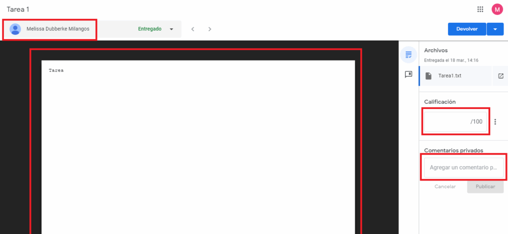 Paso 4. En esta ventana nos aparecerán los datos del alumno y su tarea. Asignamos la puntuación, y podemos de igual forma, dar una retroalimentación en los comentarios.