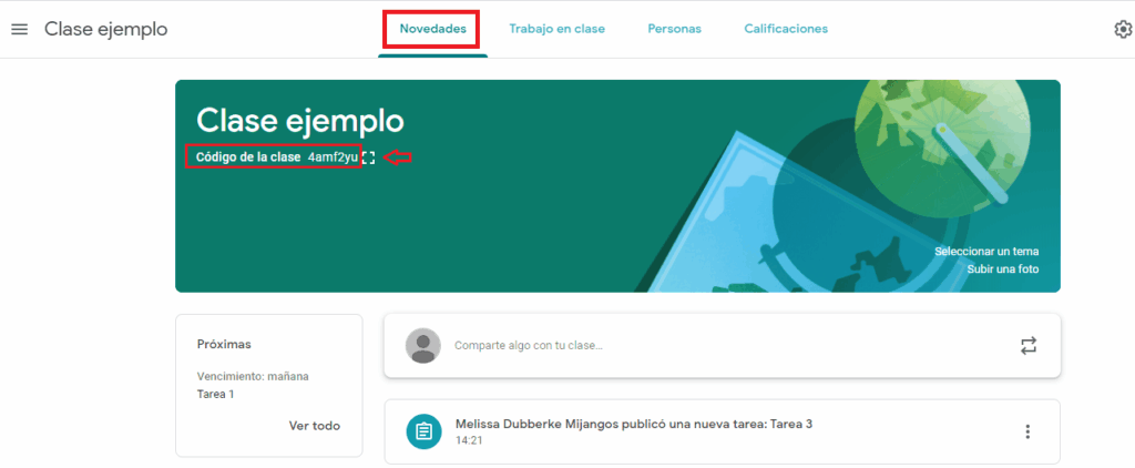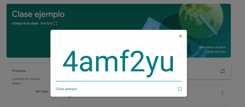 • El código de clase se puede encontrar fácilmente en la parte superior izquierda de nuestra pestaña de novedades. Al darle clic al símbolo de mostrar, el código se mostrará en una ventana emergente.