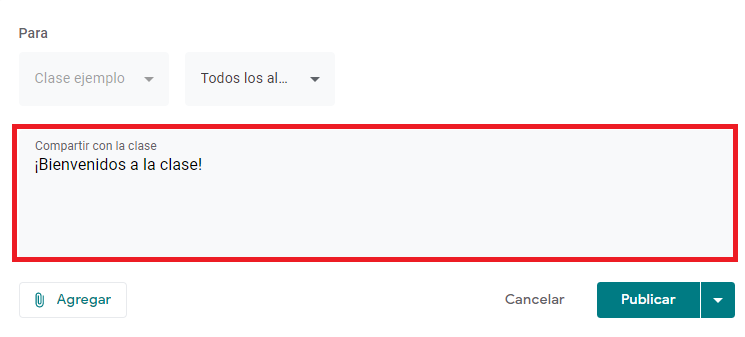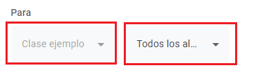 • Paso 4. La publicación se puede compartir en una clase o más clases. En “para”, elegimos en dónde se publicará nuestro anuncio. Si queremos compartir la publicación solamente a ciertos alumnos, podemos elegirlos manualmente.