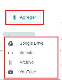 • Paso 3. Si queremos agregar un archivo o enlace, le damos clic a agregar. Nos aparecerán las opciones: google drive, vínculo, archivo, Youtube.
