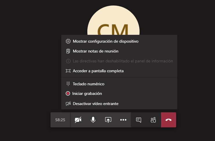 Si damos clic en la opción de más acciones, podemos seleccionar grabar nuestra sesión, entre otras funciones.