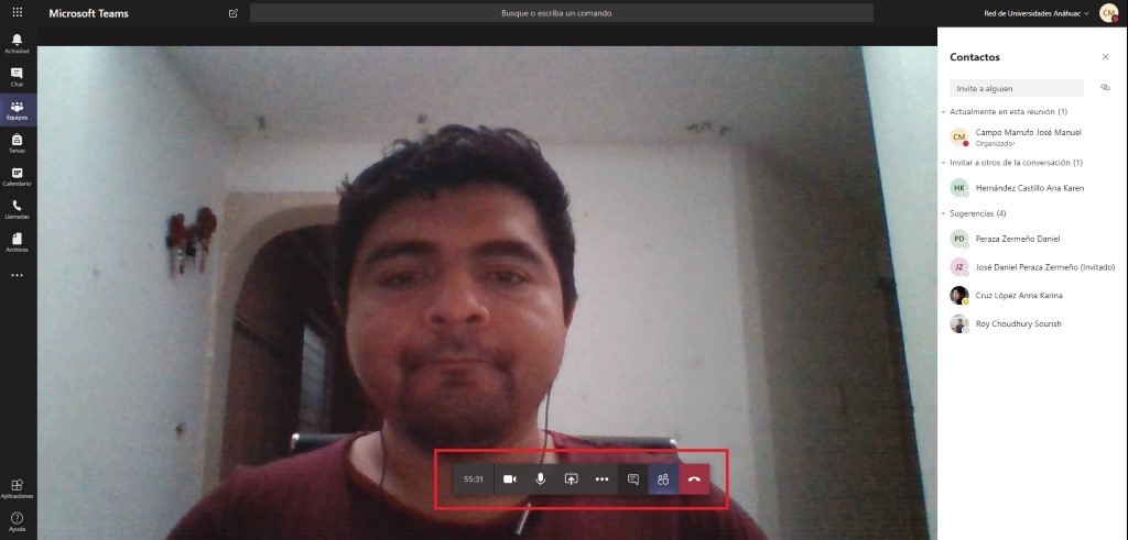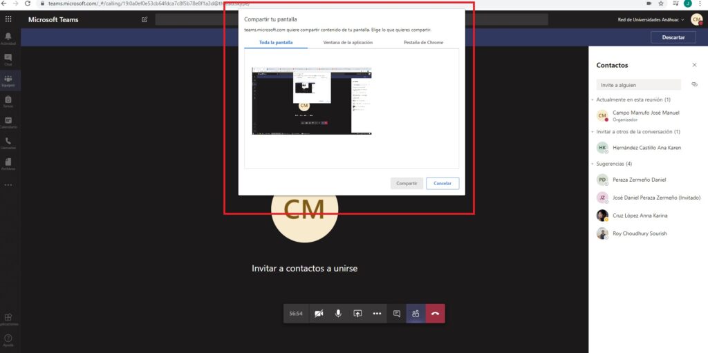 En pantalla aparecerá una barra con herramientas en donde podremos compartir la imagen de nuestra cámara, nuestro audio, compartir lo que vemos a cuadro, ver nuestro chat, ver nuestros contactos y por último finalizar la conferencia.