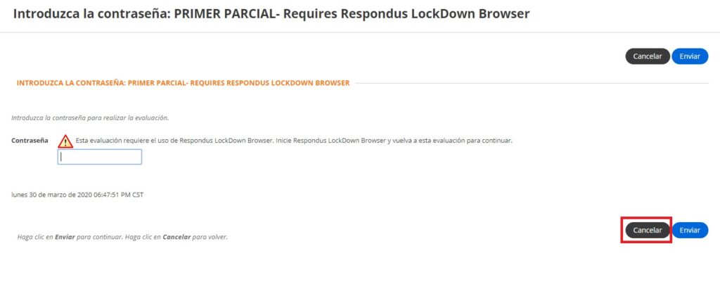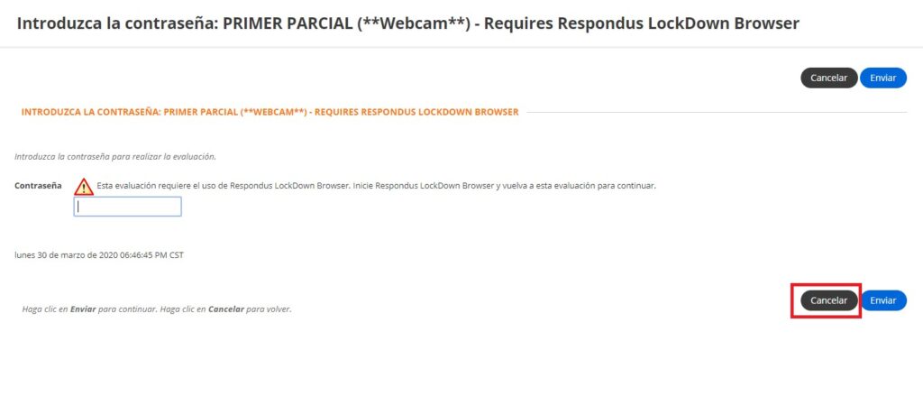 Da clic en cancelar para salir, ya que no es aquí donde contestarás el examen