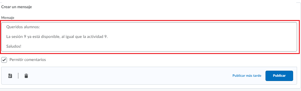 • Paso 3. Redactamos el mensaje que queremos publicar. Tenemos la opción de poder activar o desactivar permitir comentarios, para que los alumnos puedan responder a nuestra publicación.