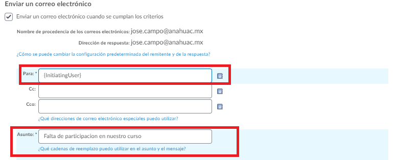 Paso 15. Al momento de programar el correo, en la casilla de Para insertaremos la siguiente cadena de reemplazo {InitiatingUser} para que de forma automática el correo se envíe a todos los alumnos que no hayan entrado a consultar el curso acorde a nuestra programación en la sección de Criterios.