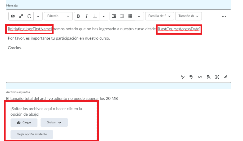 {InitiatingUserFirstName} y {LastCourseAccessDate} para que se reemplace el nombre del alumno y la última fecha de acceso de nuestros alumnos.
