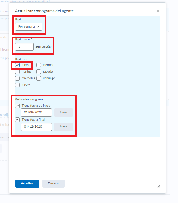 Paso 19. Aparecerá la siguiente ventana en donde estableceremos, el día en que nuestro agente inteligente deberá procesarse y el periodo de tiempo en el que se realizará en ciclos el proceso.