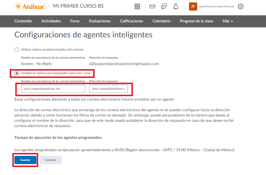 Paso 4.Primero estableceremos el nombre de procedencia de los correos electrónicos que el Agente Inteligente enviará dado clic en Establecer valores personalidades para este curso.