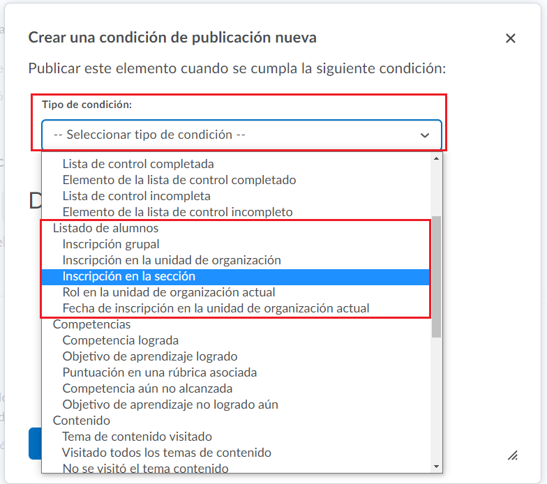Paso 11. Seleccionamos el tipo de condición que requerimos. En este caso será por listado de alumnos, inscripción en la sección.