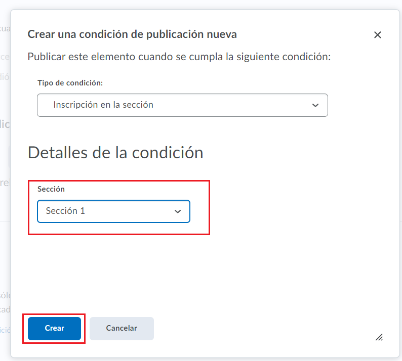 Paso 12. En detalles de la condición, elegimos la sección deseada. Al finalizar, damos clic en crear.