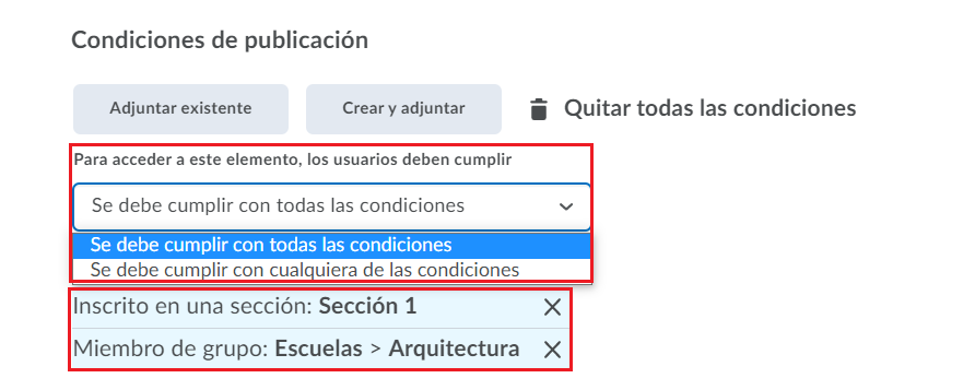 Paso 10. En condiciones de publicación podemos configurar a quiénes dentro de nuestro curso se les enviará el correo. Damos clic en crear y adjuntar.
