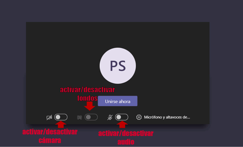 Nota: Si no ves una imagen previa al entrar a Microsoft Teams quiere decir que tu cámara esta desactivada, actÃvala presionando el botón que se encuentra al lado del icono de la cámara.Â
