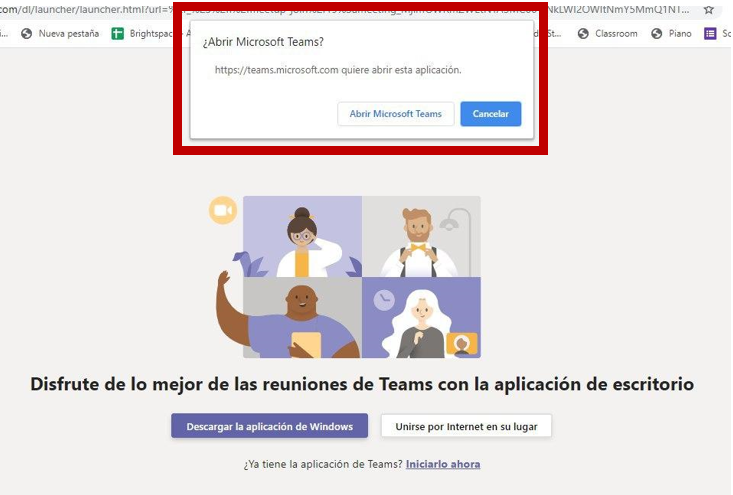 Paso 3. Serás redireccionado a una nueva pestaña que te permitirá acceder a la conferencia desde la aplicación de Microsoft Teams o desde navegador. Escoge la opción de abrir Microsoft Teams que aparece en el Pop up de la página.