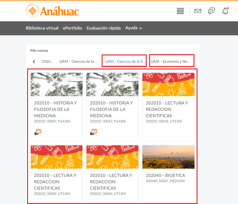 - En la página principal de la plataforma, podremos ver todos los cursos en los que tenemos un rol. Los cursos se dividen por escuelas, cómo se podrá ver en la siguiente imagen.