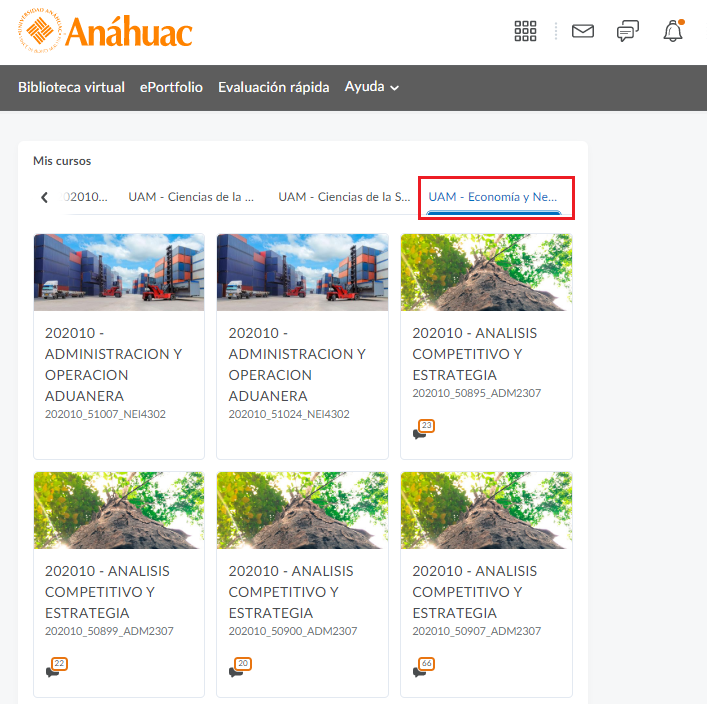 - Si le damos clic a otra de las escuelas, como por ejemplo: economía y negocios. Nos aparecerán solamente los cursos que pertenecen a esa escuela.