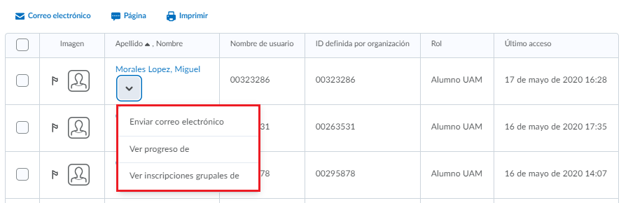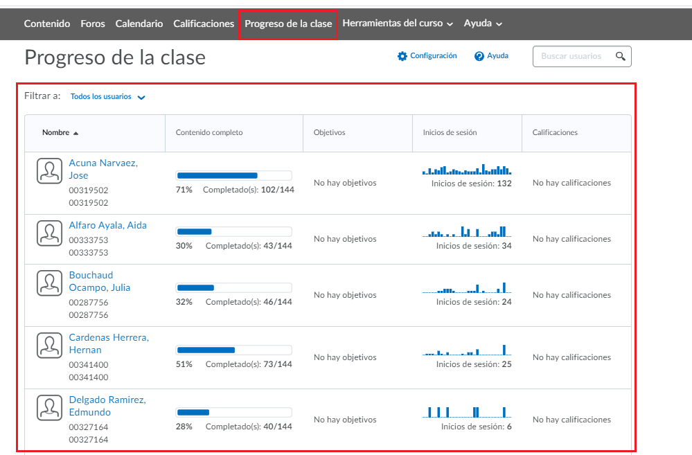 - Nos aparecerá un listado de todos los alumnos inscritos en el curso, con información de su progreso dentro del curso.