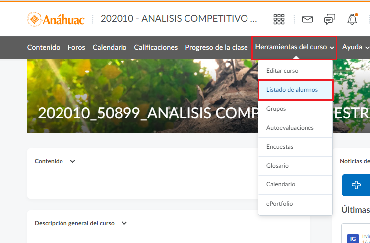 - Paso 7. Para ver la lista de todos los usuarios inscritos al curso, le damos clic a herramientas del curso y elegimos la opción de listado de alumnos.