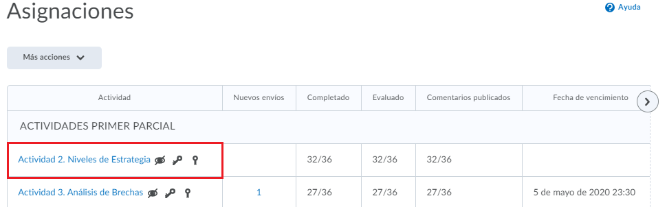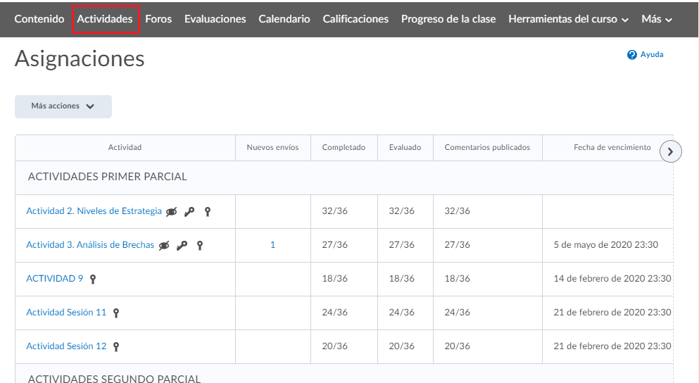 - Paso 3. En la pestaña de actividades podremos ver la lista de todas las actividades del curso con su respectiva información.